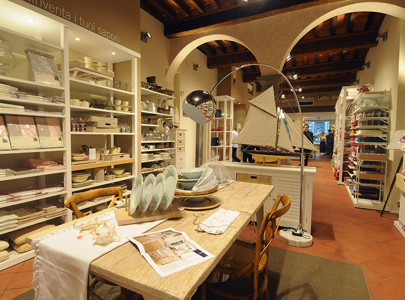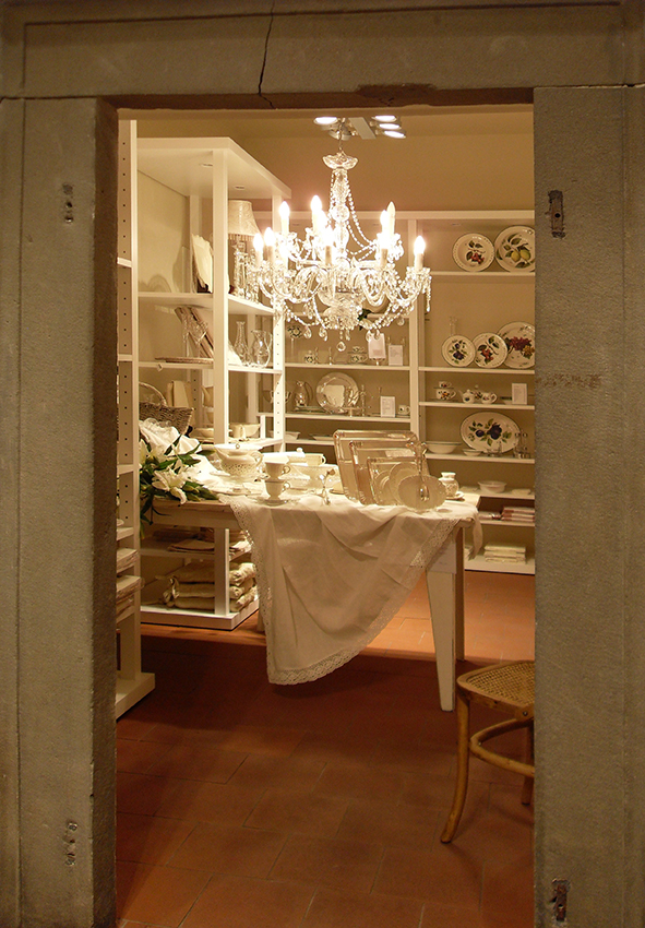 Nelle stanze adiacenti, a destra, trovano sistemazione gli utensili della cucina e a sinistra della camera e del bagno, come se stessimo percorrendo una vera grande dimora.  Nel cortile, sono sistemati gli arredi per il giardino e i prodotti per l’illuminazione.