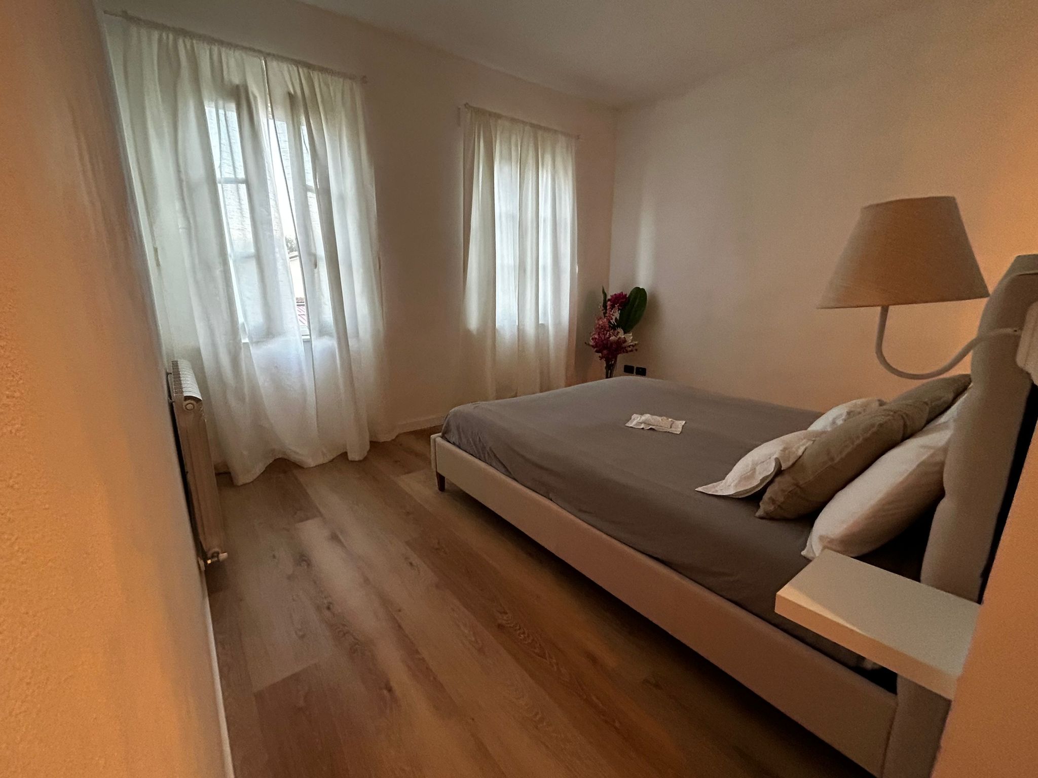 Nella camera padronale è stata inserita una grande cabina armadio, nascosta da una quinta che funge anche da testata del letto.