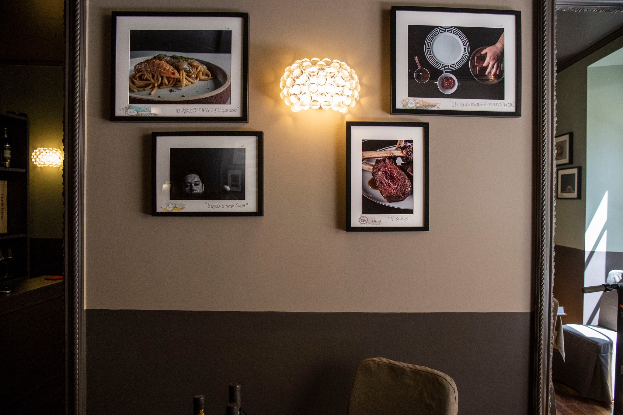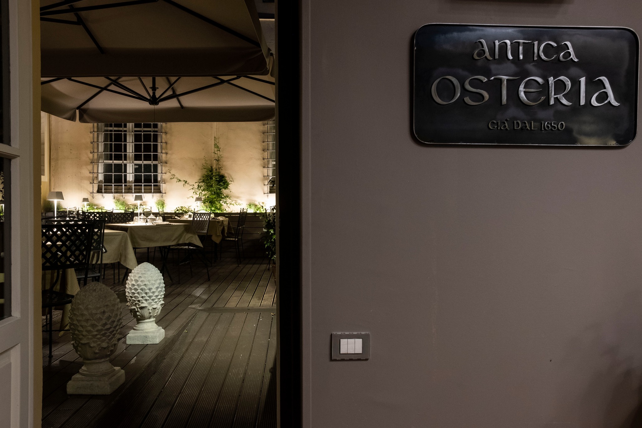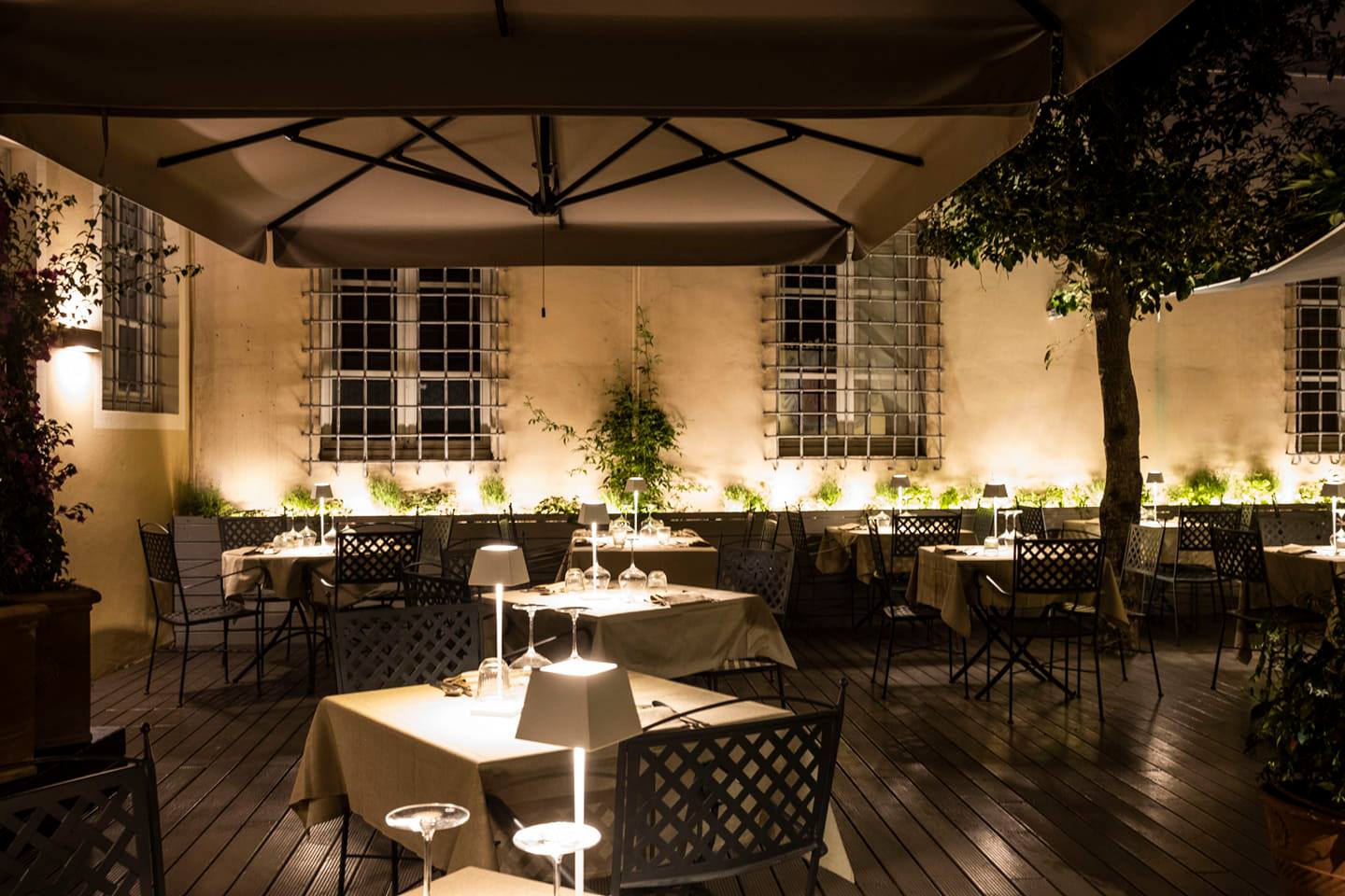 L’osteria al piano terra si dilata nel cortile interno al palazzo: qui ritroviamo i colori della terra, il grigio ed il testa di moro, in un piacevole connubio con la vegetazione e l’illuminazione.